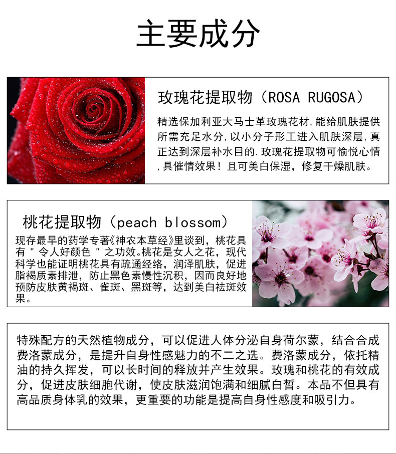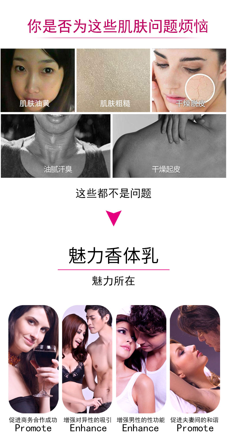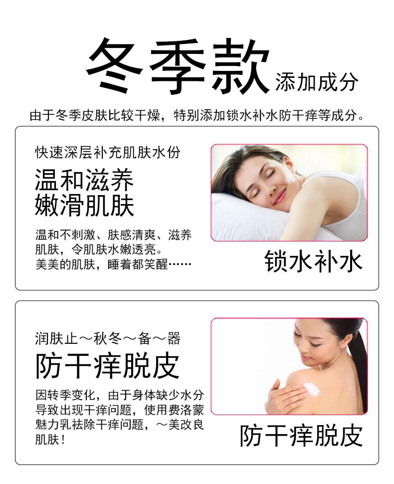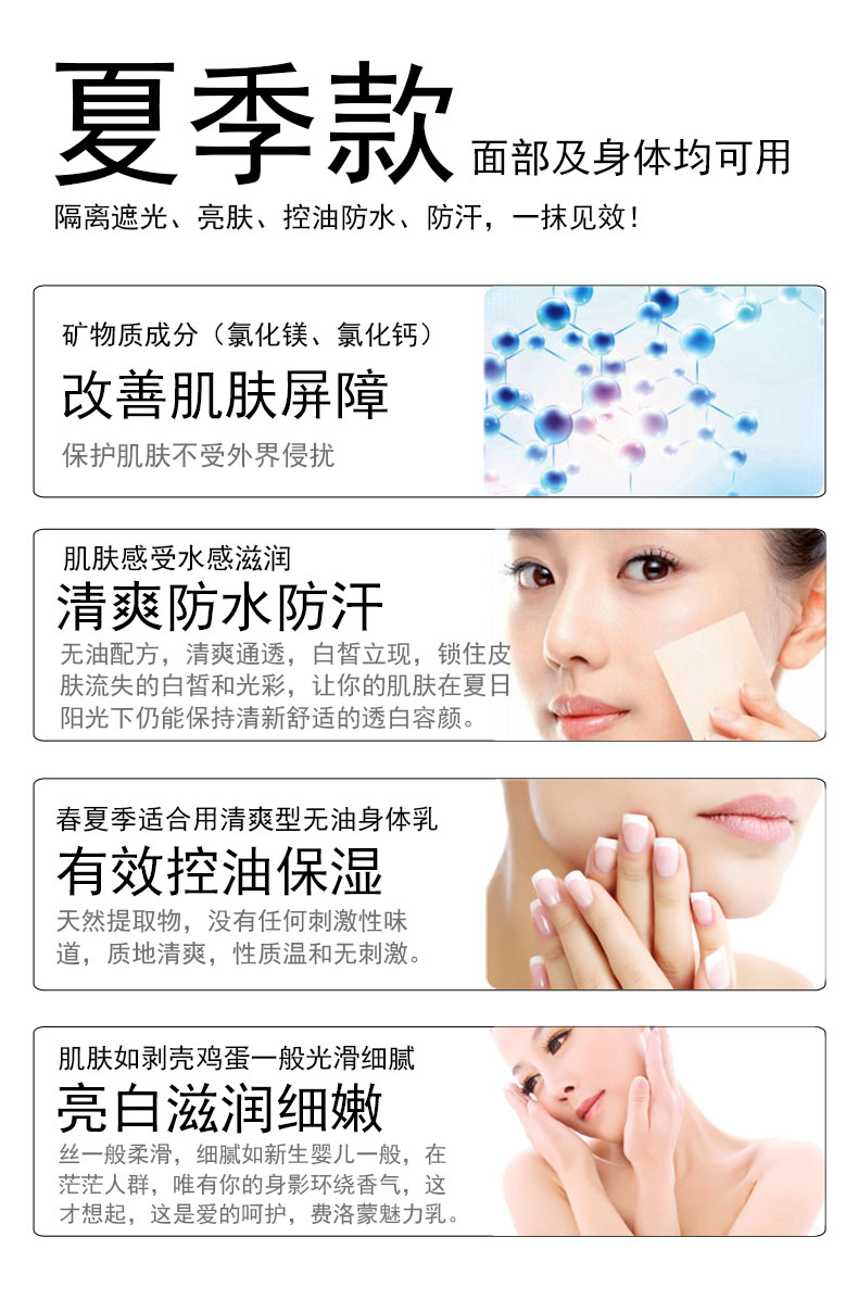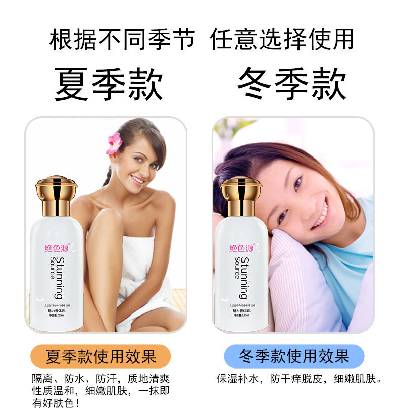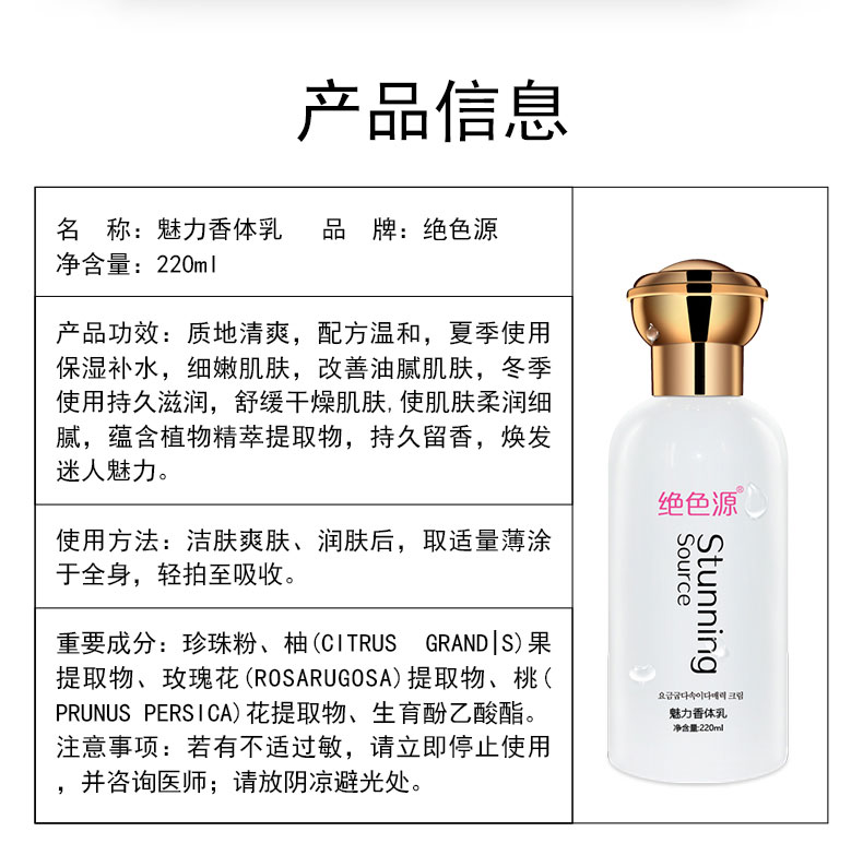 產(chǎn)品功效:質(zhì)地清爽,配方溫和,夏季使用保濕補(bǔ)水,細(xì)嫩肌膚,改善油膩肌膚,冬季使用持久滋潤(rùn),舒緩干燥肌膚,使肌膚柔潤(rùn)細(xì)膩,蘊(yùn)含植物精萃提取物,持久留香,煥發(fā)迷人魅力。