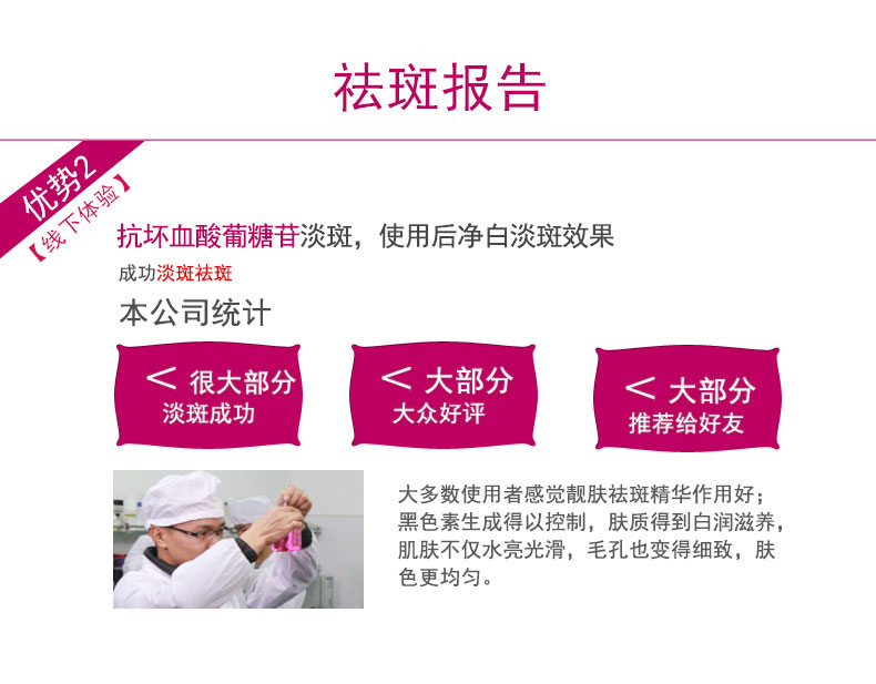 產(chǎn)品作用:七到十天凈色淡斑、亮膚潤(rùn)膚、補(bǔ)水保濕、細(xì)致毛孔,不紅腫不脫皮。